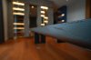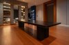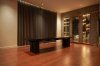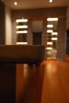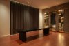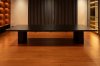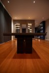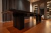 โต๊ะไม้ประสาน 4 แผ่น ขอบตัดตรงย้อมสีดำเปิดเสียน บิ้วอินปลั๊กไฟในตัวโต๊ะและซ่อนสายไฟในแบบที่ลูกค้าต้องการ